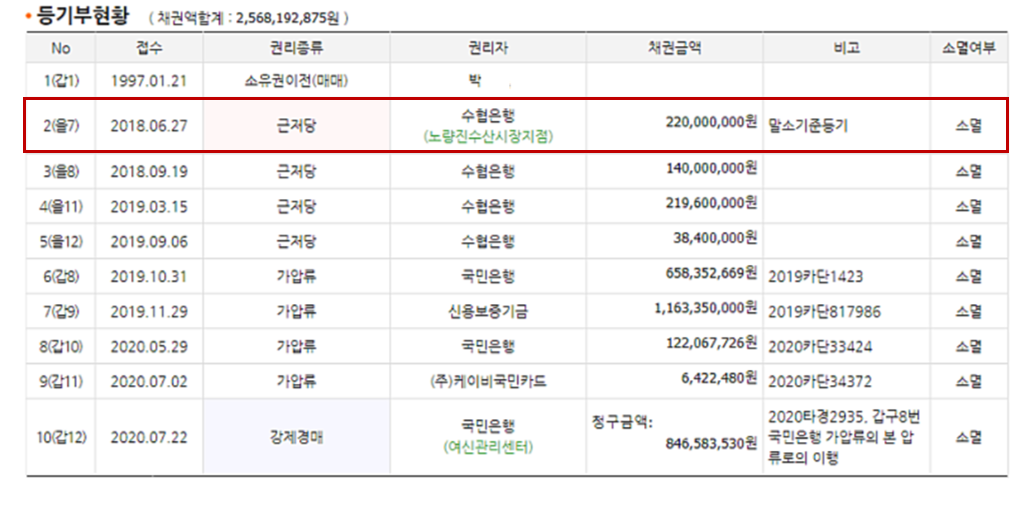 말소기준권리는 통상적으로 경매에서 매각 후 전부 소멸되는 권리, 즉 낙찰자에게 인수되는 권리인지 판단하는 기준이 되는 권리를 말합니다. 말소기준권리가 될 수 있는 것은 근저당권, 가압류(압류), 담보 가등기, 경매기입등기, 전세권(배당을 요구한 선순위 전세권) 등 5가지입니다. 위의 권리가 2개 이상인 경우, 가장 앞선 순위의 것이 말소기준권리가 되며 이후의 권리들은 모두 소멸됩니다. 해당 내용은 등기부등본 [갑구]에서 확인할 수 있습니다. 아래 예시에서는 박스로 표시된 권리가 말소기준권리입니다.