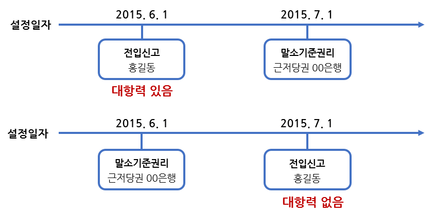 대항력이란 임차한 주택이 경매로 인해 소유자가 변경되더라도 계약한 임대차 기간 동안 계속 거주할 수 있고, 그 기간이 종료되면 임차보증금을 모두 돌려받을 수 있는 임차인의 권리를 말합니다. 대항력이 성립하려면 반드시 전입신고가 되어있어야 합니다(전입신고 다음 날 0시부터 대항력이 발생). 그리고 말소기준권리보다 전입신고가 빠르면 임차인의 권리가 낙찰자에게 인수되고, 전입신고가 더 늦으면 소멸되어 낙찰자에게 대항할 수 없습니다.