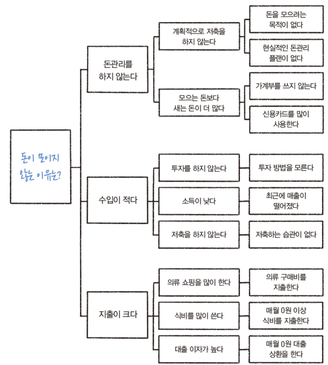 2) Why tree(원인분석) : '돈이 모이지 않는 이유'를 중심토픽으로 하여 파악
