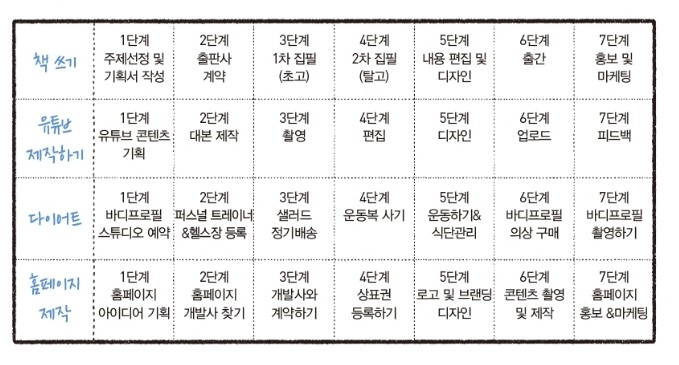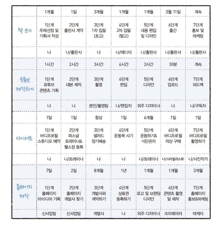 9단계 : (뒷면) 7스텝의 소요시간과 책임자 적기 | 7스텝으로 나누면 일의 흐름이 한눈에 보입니다. 그리고 일은 쪼개면 쪼갤수록 단순해집니다. 일을 잘 진행하기 위해서는 각 스텝마다 소요시간을 정확히 파악해야 합니다. ![]() |