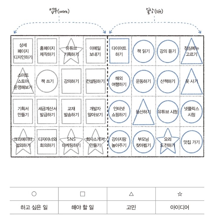 이 책에서 저자는 생각 뿐 아니라 시간, 목표, 문제를 정리하는 방법도 같이 제안합니다. 생각 정리부터 차례로 알아보겠습니다.