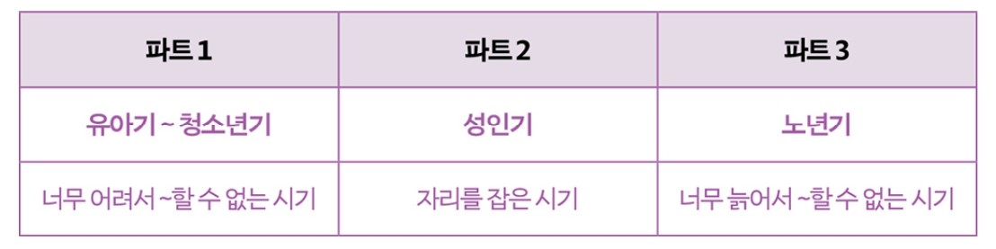 이 표에 따르면 성인기만이 긍정적인 가치를 갖습니다. 결과적으로 인생의 나머지 두 파트가 무가치하고 권한이 없고, 소외된 상태로 남게 되는 것이지요. 따라서 우리는 온전함을 기반으로 하는 새로운 생애 주기 모델을 받아들여야 합니다.