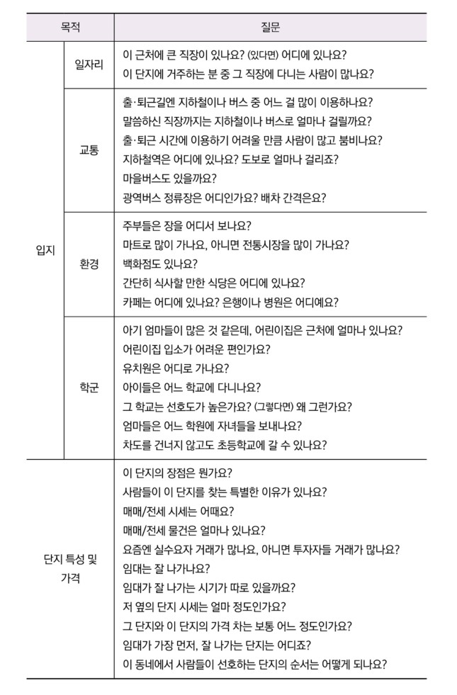 이미 지역을 눈에 담는 과정을 거쳤기에 그 집의 구조와 물건별 내부 상태, 매도 상황 정도만 확인하면 됩니다. 중요한 건, 똑같이 소액으로 투자할 수 있는 단지라면 그 동네에서 가장 선호도가 높은 물건부터 우선 확인해야 한다는 것입니다. 같은 돈을 주고 살 수 있는 최고의 물건을 사는 것이 핵심입니다. 아직 경험이 많지 않은 사람이라면, 하루에 3~4시간 간격으로 부동산 중개소 2~3곳을 방문하고, 5~6개, 많아도 10개 미만의 물건을 보는 것부터 추천합니다. 중개소에서 어떤 대화를 할 지 막막하다면 아래 질문들을 참고하는 것도 좋습니다.